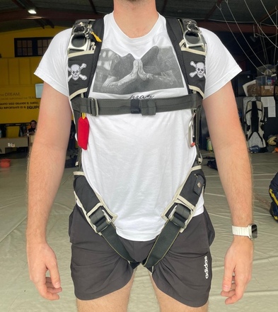 about 300 jumps on it, exciting scull “sky pirate” on the bottom skin, well know hybrid canopy with good on-heading, predictable openings and powerful flare. Excellent shape
